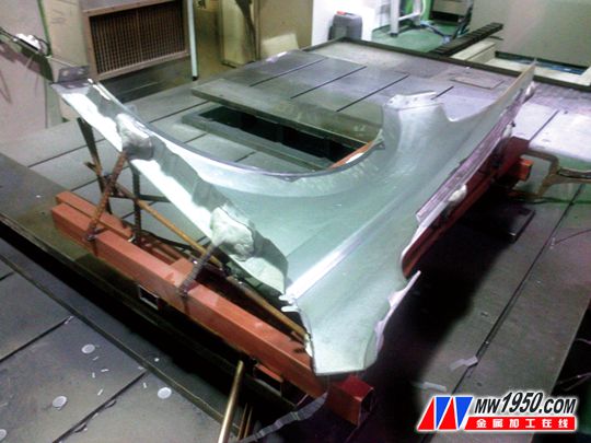 圖3 插板式支架切割車門外板 對于離線編程:使用編程軟件利用工件的數控模型編程(見圖3)。這種方式的優點很多,首先,效率高,編程速度快;其次,不占用機床,可以提前編制多個程序,方便安排生產;并且此類程序方便更改,對稱工件無需要重復編程。相比示教編程,不需要全尺寸的刻線件,只需要幾個刻線點(三個以上)即可。但這種編程方式準確度低,后期改動大。因為離線編寫的程序在機床加工時對程序坐標系的定位是通過實際采集刻線點的機床坐標值與數據模型中的理論坐標值進行比對,通過某種算法擬合程序。也就是說,它會對實際工件的偏差做出相對應的調整,使程序的軌跡更貼近于實際工件。但是這種策略幾乎可以肯定,實際加工出來的工件會有所偏差。而數據點的采集一般設在較容易采集區域,只是根據這三個點間偏差來回移動坐標系,難免無法顧及全部。因此,在實際生產中,必須對程序進行調整。 (2)工裝支架 工裝支架通常有兩種制作方式。一種是插板式的,即通過切割出對應產品形狀的鋼板,彼此拼搭而成。這種方法速度快,效率高,是一種粗定位。另一種是用鋼筋(管)焊在底座上和產品搭接部分或使用舊件的一部分(手工切割下來),或使用樹脂塊和產品貼附。這種方法更貼近實際工件。三維激光切割主要面對的是拉延件,無法用銷子等孔來定位,只能靠工件的形狀來定位,而薄板件的變形量又比較大,所以生產中在支架上輔以磁鐵等加強定位,如圖4、圖5所示。